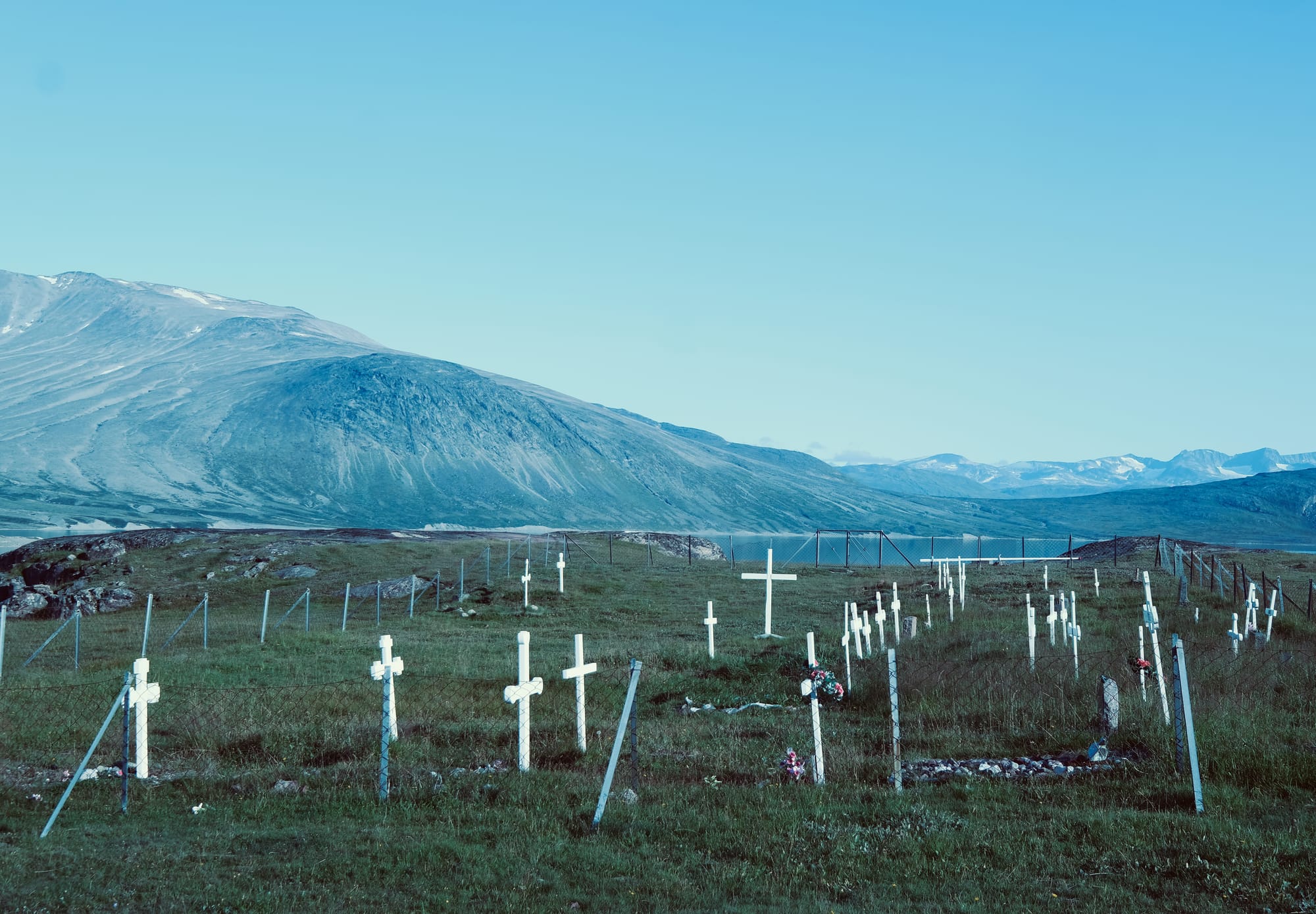 I have some time on my hands in Qaqortoq in Greenland, so I walk up to the little cemetery. Or not so little, for a town of this size. It is spilling up the hillside, a spray of simple, self-similar white crosses, as though the Lutherans had taught the Inuit that death, like life, was nothing more than a replication in which we all participate. This is how we mark your passing, another white cross in the stubborn litany of white crosses inscribed on the bare hillside like the etched, crossed lines of a prisoner marking the days to release. Congratulations. You have done your time.