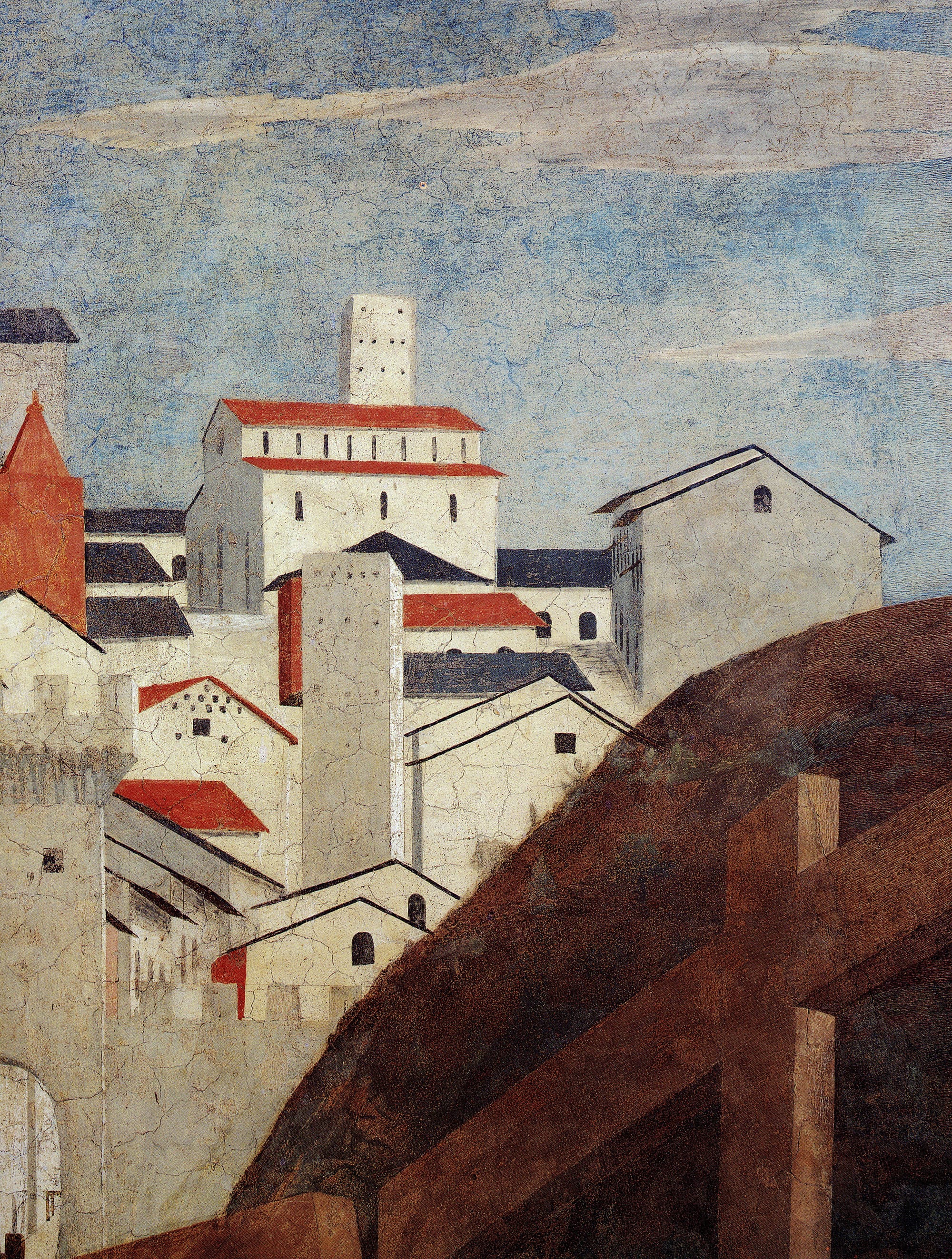 Standing in the chapel where the fresco actually is – the apse chapel of the church of San Francesco in Arezzo – you will not really see the little painted city unless you close your eyes. You will not see it, because the chapel is tall and narrow and the picture of the city is a not-considerable part of a large frescoed panel. It is high up to the left as you face the altar. Crane your neck if you like; without a ladder, or a plank of scaffold on which to perch, you will see little, a mere suggestion of city, a higgledy pile of while geometric buildings, cubes and cylinders, oblong towers and planes of roofs.